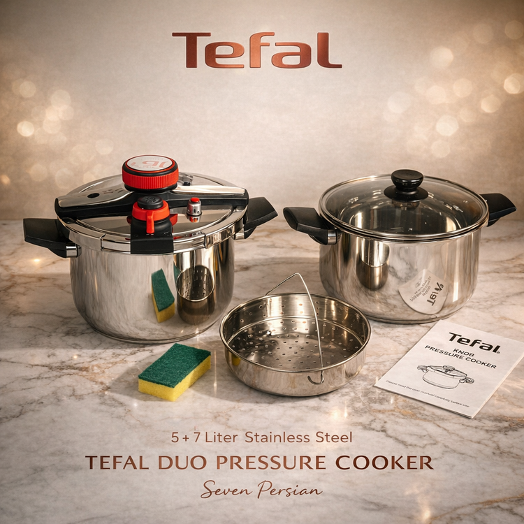 زودپز دوقلو تفال با ظرفیتهای ۵ و ۷ لیتری انتخابی ایدهآل برای خانوادههای کمجمعیت تا پرجمعیت است. طراحی استیل براق با درب ایمن و سوپاپ اطمینان چندگانه، این محصول را به یک گزینه حرفهای و مطمئن تبدیل کرده است.